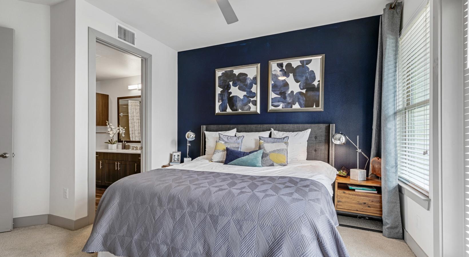 • a bedroom with a bed and a fan